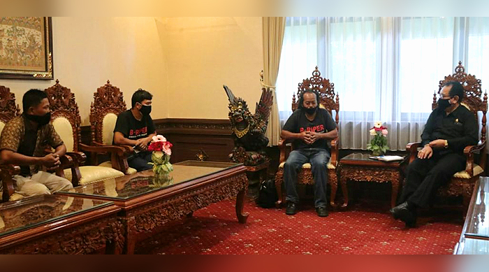 DENPASAR- Wakil Gubernur Bali Tjokorda Oka Artha Ardana Sukawati menerima audiensi dari Ketua Komunitas Bhakti Ring Pertiwi (B- Riper) Desa Penebel, Tabanan, Putu Parta di ruang kerjanya, Senin (25/1/2021).