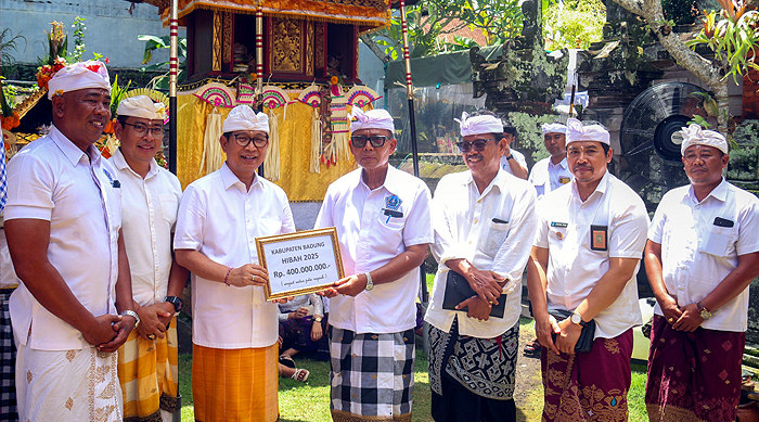 Bupati juga menyerahkan secara simbolis bantuan dana hibah Anggaran Pendapatan dan Belanja Daerah (APBD) Induk 2025 sebesar Rp400 juta, yang diterima langsung oleh Ketua Panitia, Nyoman Artana.